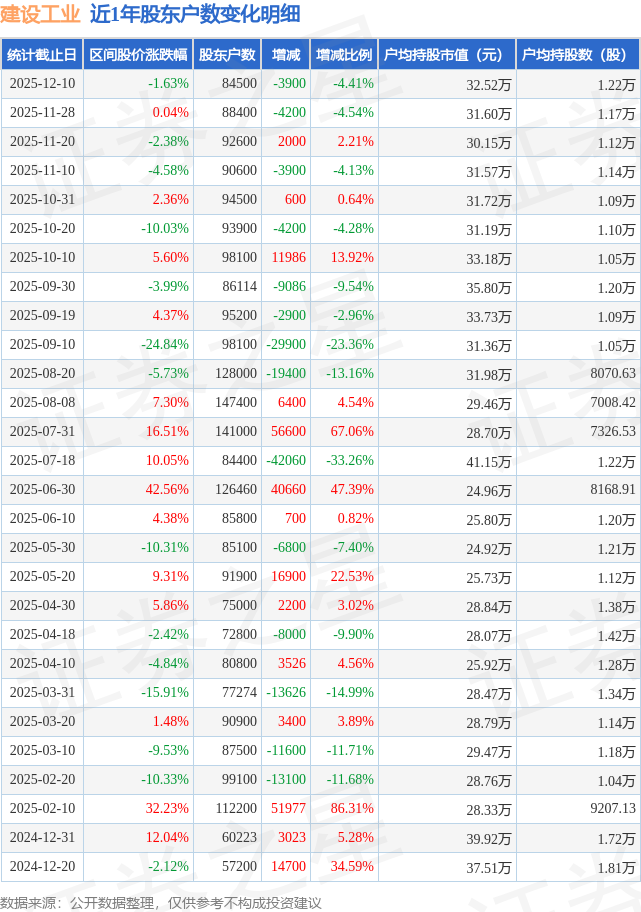 从股价来看,2025年11月28日至2025年12月10日,建设工业区间跌幅为1.63%,在此期间股东户数减少3900.0户,减幅为4.41%。