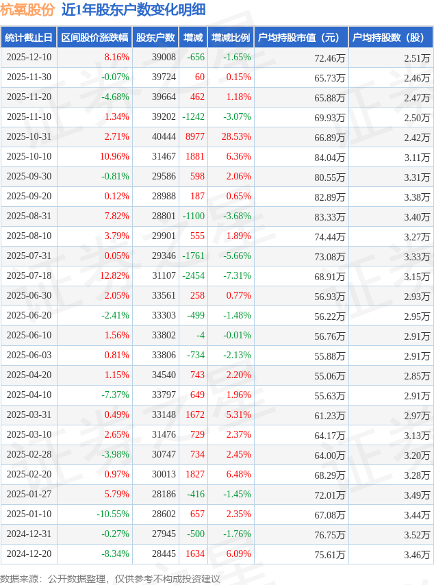从股价来看,2025年11月20日至2025年12月10日,杭氧股份区间涨幅为8.16%,在此期间股东户数减少656.0户,减幅为1.65%。