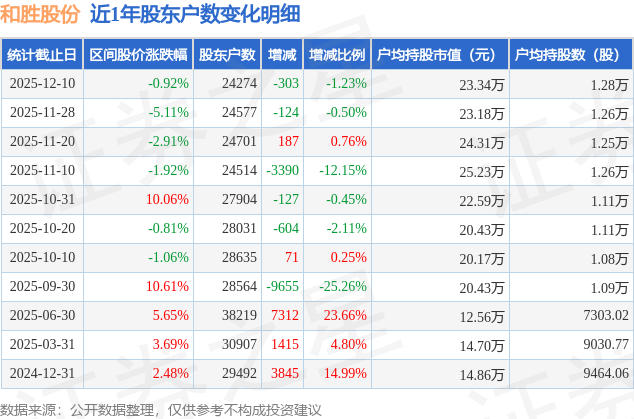 从股价来看,2025年11月28日至2025年12月10日,和胜股份区间跌幅为0.92%,在此期间股东户数减少303.0户,减幅为1.23%。