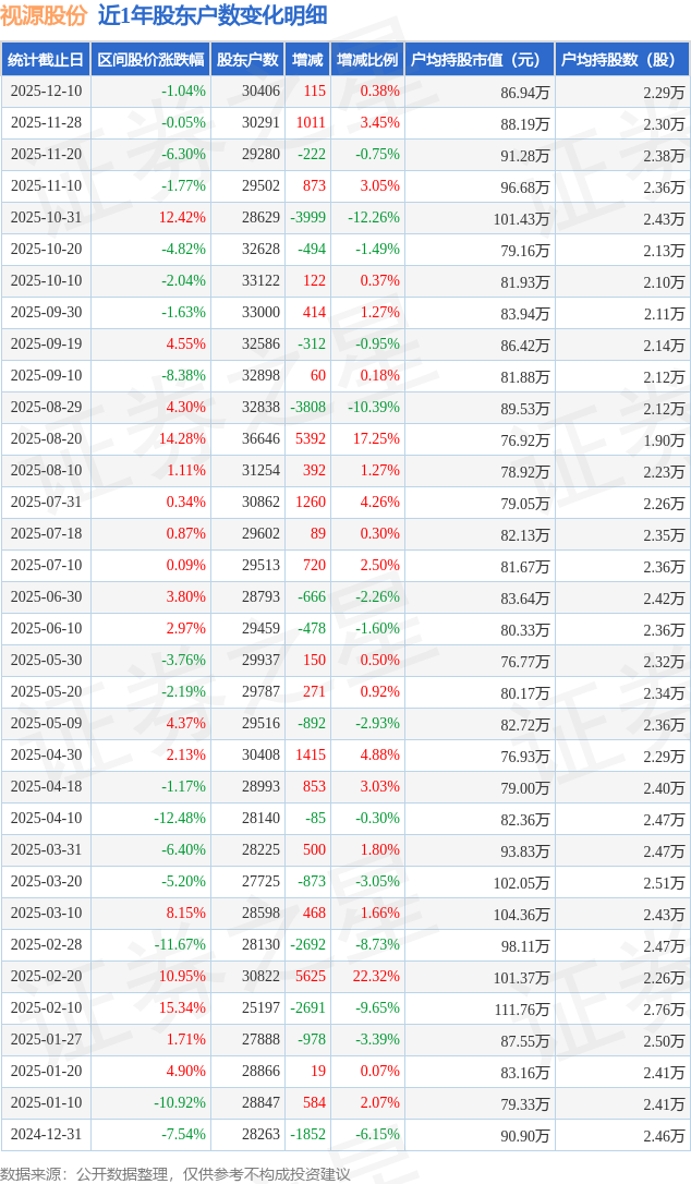 从股价来看,2025年11月28日至2025年12月10日,视源股份区间跌幅为1.04%,在此期间股东户数增加115.0户,增幅为0.38%。