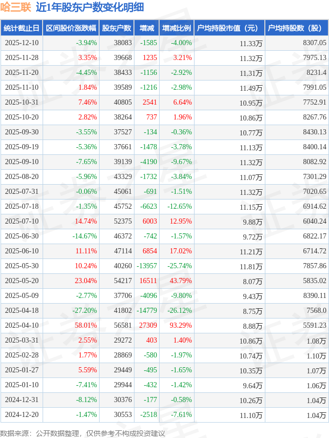 从股价来看,2025年11月28日至2025年12月10日,哈三联区间跌幅为3.94%,在此期间股东户数减少1585.0户,减幅为4.0%。