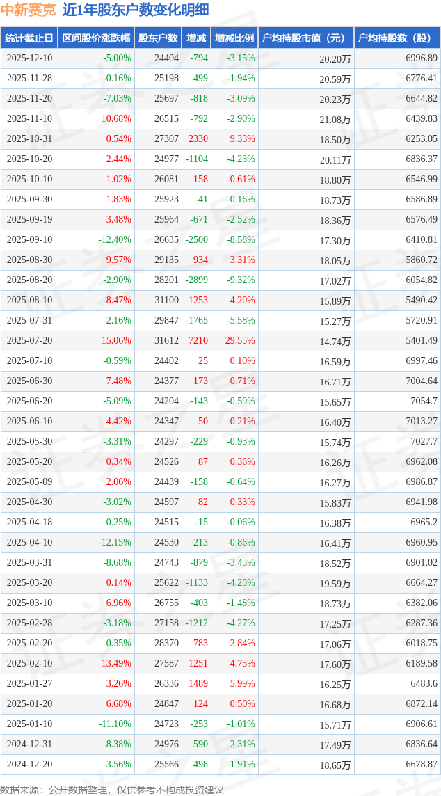 证券之星消息,近日中新赛克披露,截至2025年12月10日公司股东户数为2.44万户,较11月28日减少794.0户,减幅为3.15%。户均持股数量由上期的6776.0股增加至6997.0股,户均持股市值为20.2万元。