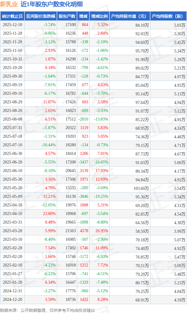从股价来看,2025年11月28日至2025年12月10日,新乳业区间跌幅为3.74%,在此期间股东户数增加864.0户,增幅为5.32%。