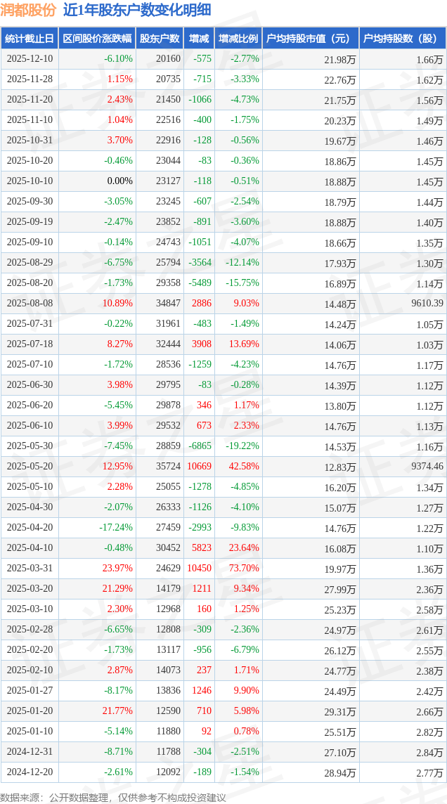 从股价来看,2025年11月28日至2025年12月10日,润都股份区间跌幅为6.1%,在此期间股东户数减少575.0户,减幅为2.77%。