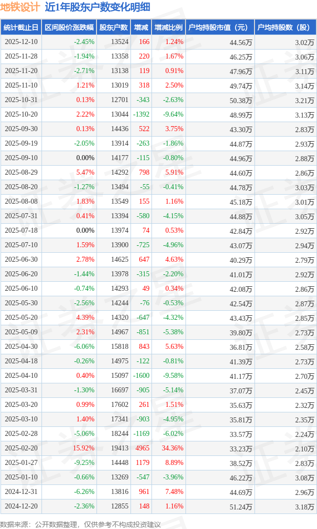 证券之星消息,近日地铁设计披露,截至2025年12月10日公司股东户数为1.35万户,较11月28日增加166.0户,增幅为1.24%。户均持股数量由上期的3.06万股减少至3.02万股,户均持股市值为44.56万元。