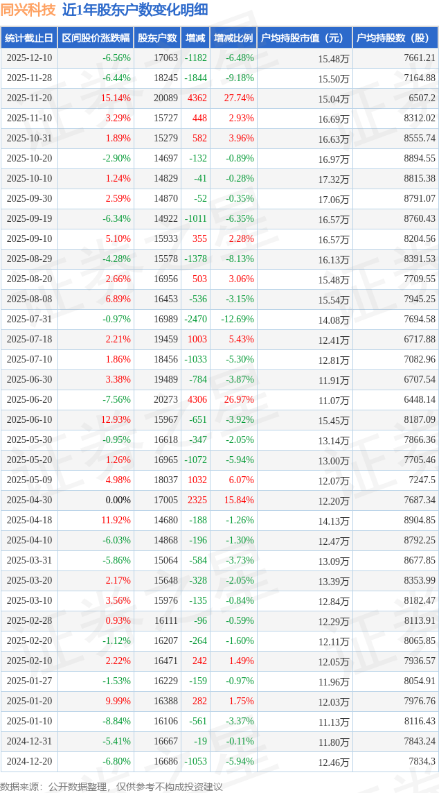从股价来看,2025年11月28日至2025年12月10日,同兴科技区间跌幅为6.56%,在此期间股东户数减少1182.0户,减幅为6.48%。
