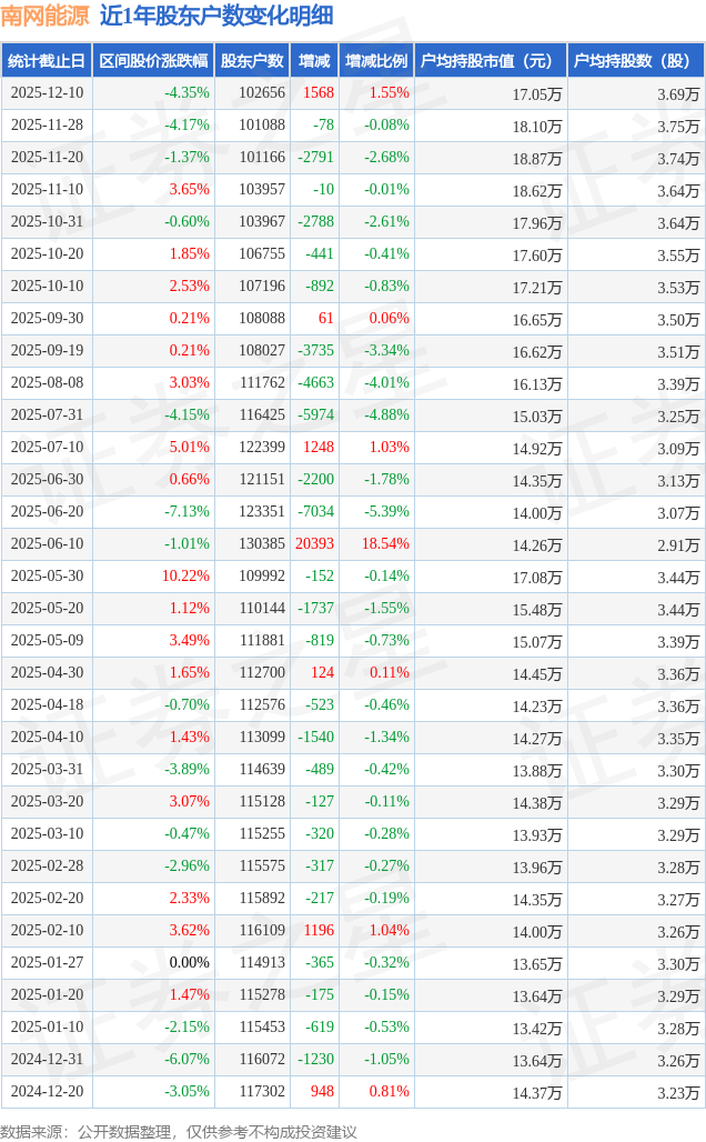 从股价来看,2025年11月28日至2025年12月10日,南网能源区间跌幅为4.35%,在此期间股东户数增加1568.0户,增幅为1.55%。
