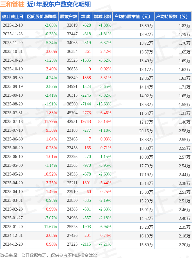 从股价来看,2025年11月28日至2025年12月10日,三和管桩区间跌幅为2.06%,在此期间股东户数减少628.0户,减幅为1.88%。