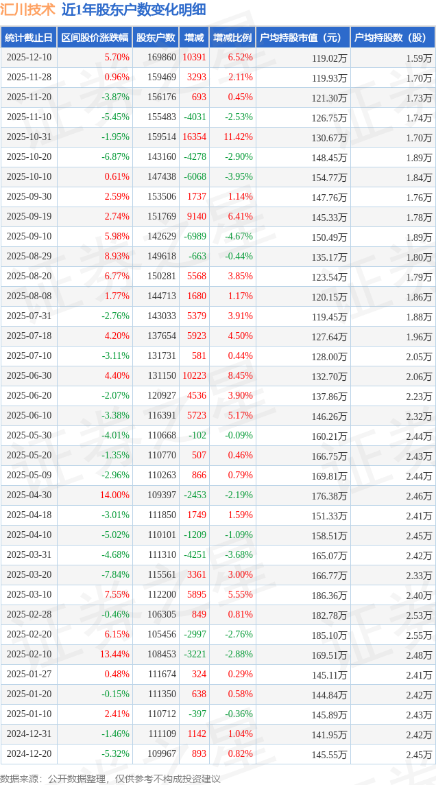 从股价来看,2025年11月28日至2025年12月10日,汇川技术区间涨幅为5.7%,在此期间股东户数增加1.04万户,增幅为6.52%。