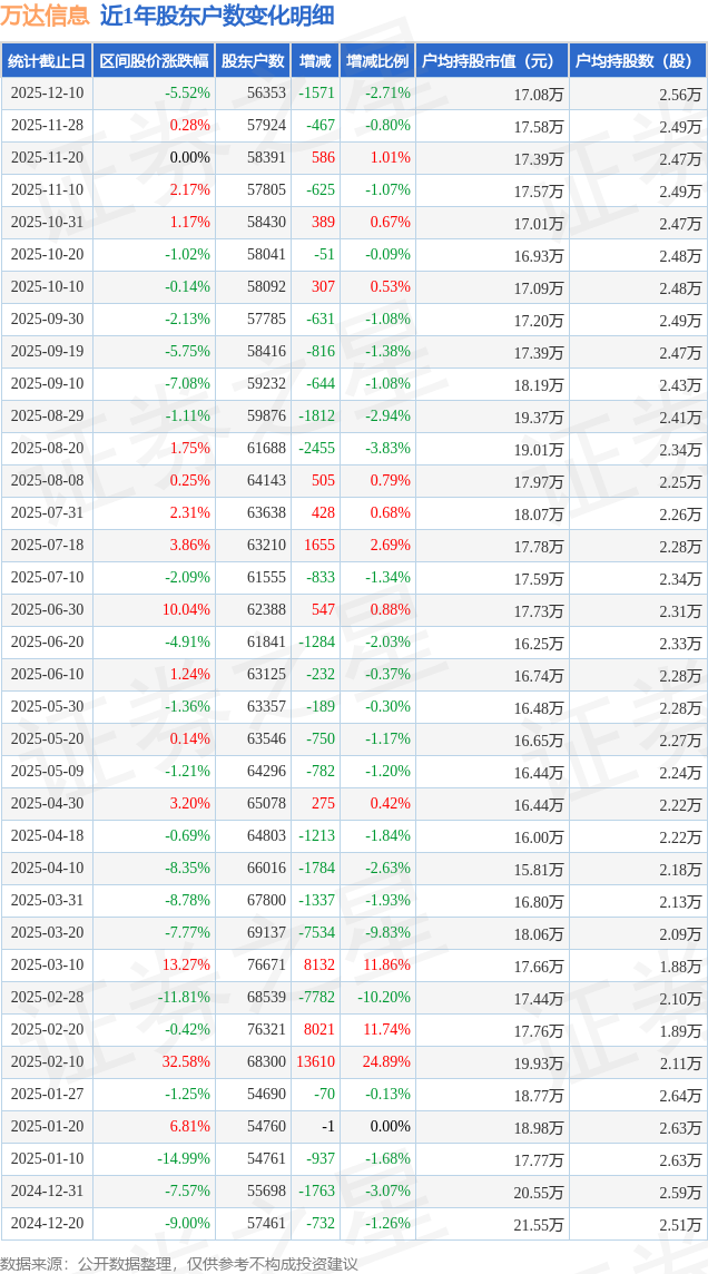 从股价来看,2025年11月28日至2025年12月10日,万达信息区间跌幅为5.52%,在此期间股东户数减少1571.0户,减幅为2.71%。