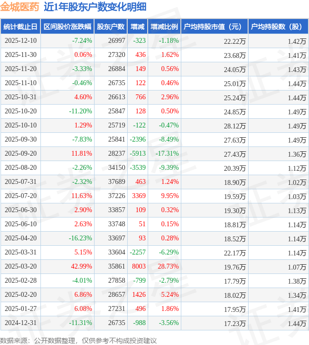 从股价来看,2025年11月30日至2025年12月10日,金城医药区间跌幅为7.24%,在此期间股东户数减少323.0户,减幅为1.18%。