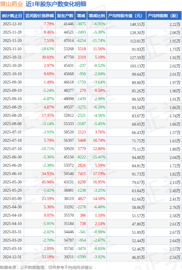 从股价来看,2025年11月28日至2025年12月10日,常山药业区间涨幅为7.79%,在此期间股东户数减少3075.0户,减幅为6.91%。