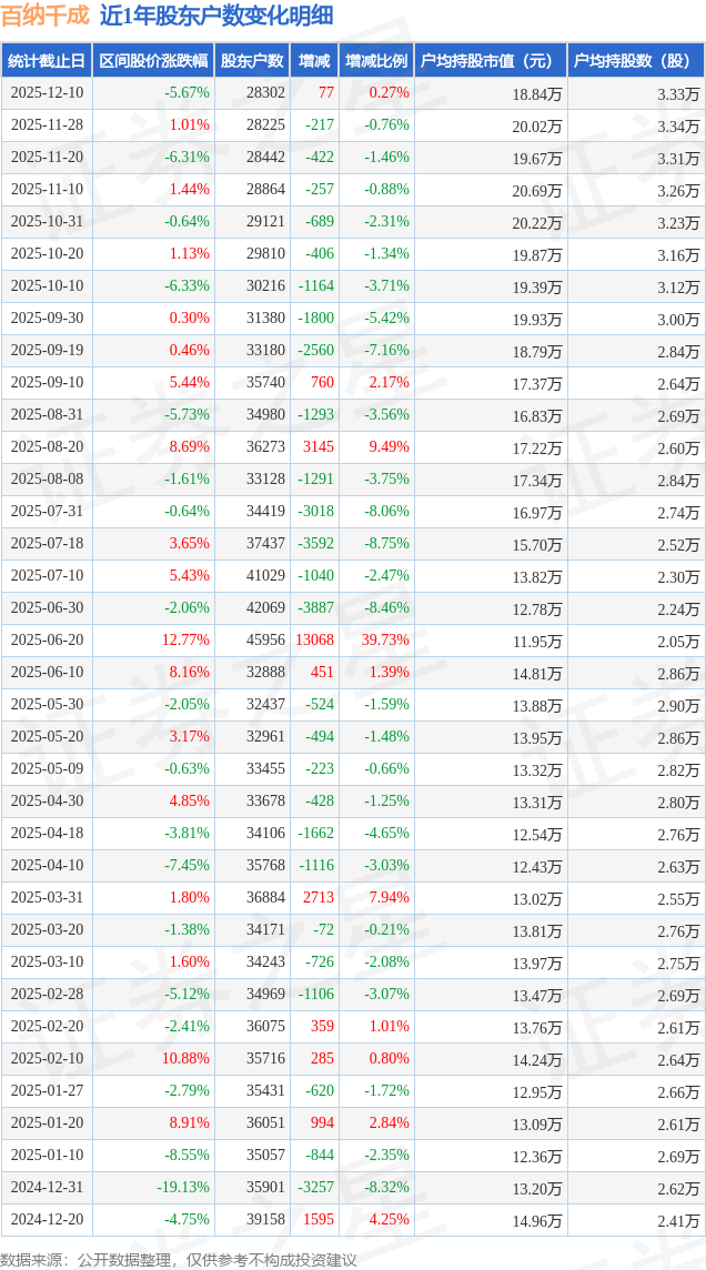 从股价来看,2025年11月28日至2025年12月10日,百纳千成区间跌幅为5.67%,在此期间股东户数增加77.0户,增幅为0.27%。