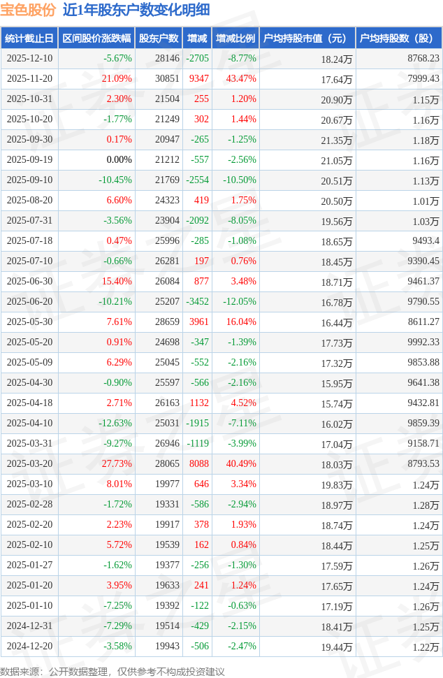 从股价来看,2025年11月20日至2025年12月10日,宝色股份区间跌幅为5.67%,在此期间股东户数减少2705.0户,减幅为8.77%。
