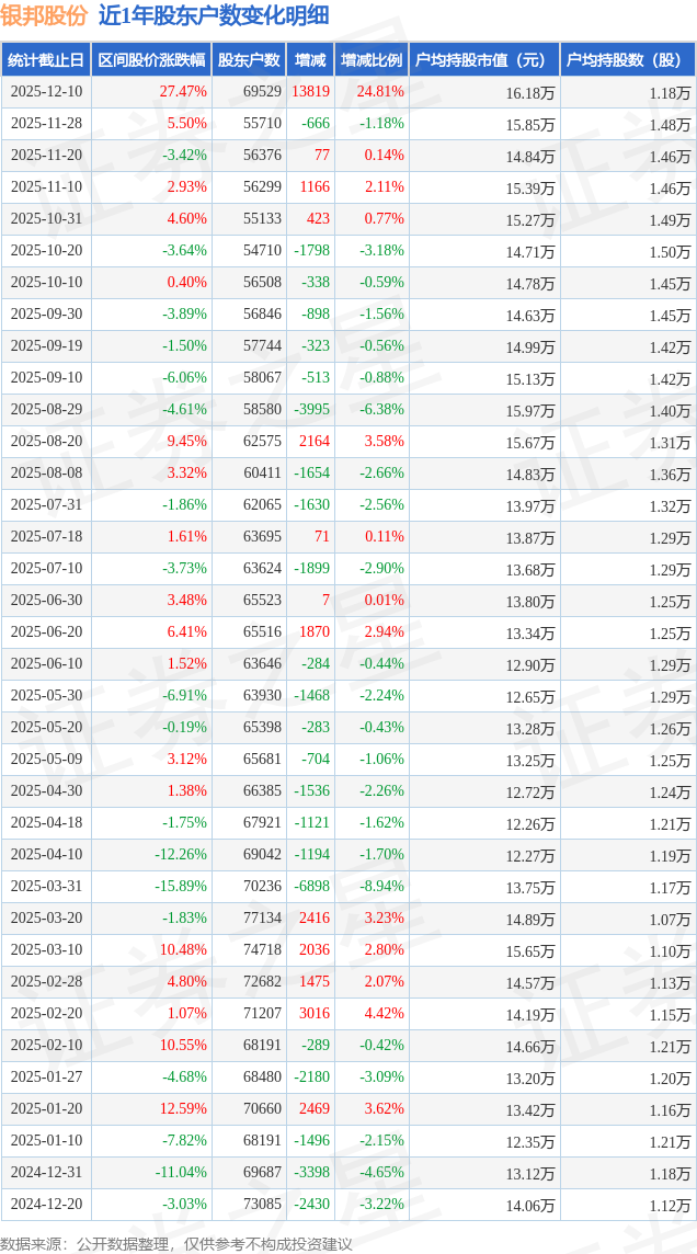 从股价来看,2025年11月28日至2025年12月10日,银邦股份区间涨幅为27.47%,在此期间股东户数增加1.38万户,增幅为24.81%。