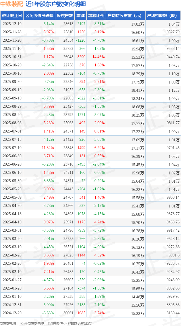 从股价来看,2025年11月28日至2025年12月10日,中铁装配区间跌幅为6.14%,在此期间股东户数减少2197.0户,减幅为8.51%。