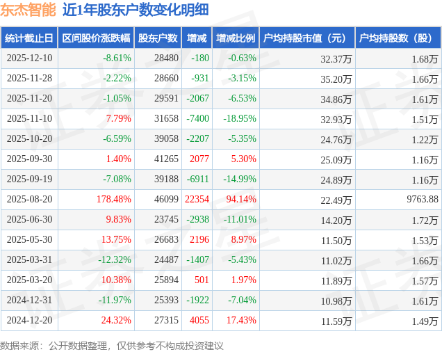 从股价来看,2025年11月28日至2025年12月10日,东杰智能区间跌幅为8.61%,在此期间股东户数减少180.0户,减幅为0.63%。
