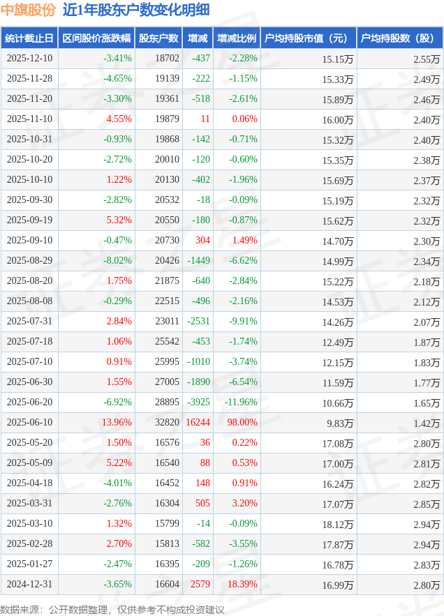 从股价来看,2025年11月28日至2025年12月10日,中旗股份区间跌幅为3.41%,在此期间股东户数减少437.0户,减幅为2.28%。