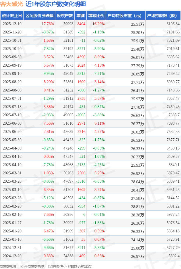 从股价来看,2025年11月20日至2025年12月10日,容大感光区间涨幅为17.76%,在此期间股东户数增加8404.0户,增幅为16.29%。