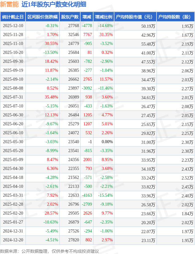 从股价来看,2025年11月28日至2025年12月10日,新雷能区间跌幅为0.31%,在此期间股东户数减少4778.0户,减幅为14.68%。