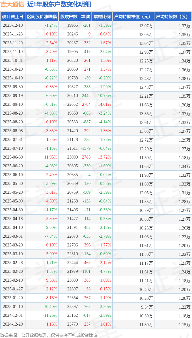 从股价来看,2025年11月28日至2025年12月10日,吉大通信区间跌幅为1.24%,在此期间股东户数减少281.0户,减幅为1.39%。