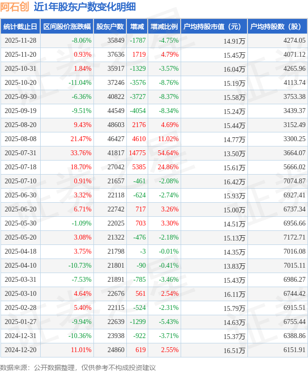 从股价来看,2025年11月20日至2025年11月28日,阿石创区间跌幅为8.06%,在此期间股东户数减少1787.0户,减幅为4.75%。