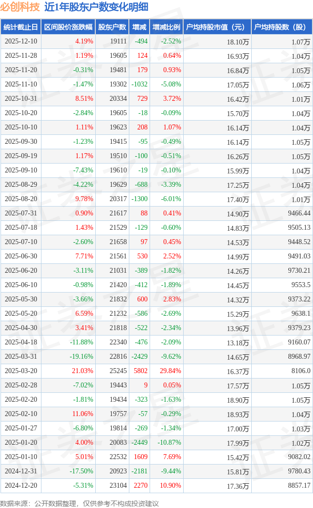 证券之星消息,近日必创科技披露,截至2025年12月10日公司股东户数为1.91万户,较11月28日减少494.0户,减幅为2.52%。户均持股数量由上期的1.04万股增加至1.07万股,户均持股市值为18.1万元。