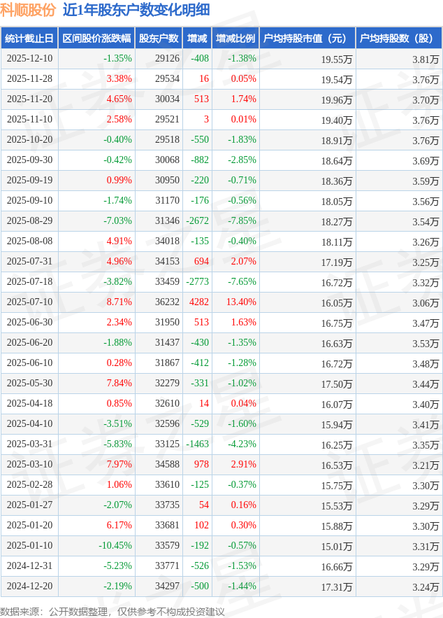 从股价来看,2025年11月28日至2025年12月10日,科顺股份区间跌幅为1.35%,在此期间股东户数减少408.0户,减幅为1.38%。