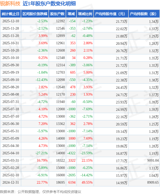 证券之星消息,近日锐新科技披露,截至2025年12月10日公司股东户数为1.24万户,较11月28日减少154.0户,减幅为1.23%。户均持股数量由上期的1.33万股增加至1.34万股,户均持股市值为21.73万元。