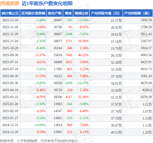 从股价来看,2025年11月28日至2025年12月10日,西域旅游区间跌幅为1.6%,在此期间股东户数减少703.0户,减幅为2.63%。