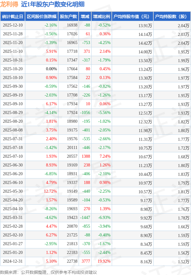 从股价来看,2025年11月28日至2025年12月10日,龙利得区间跌幅为2.16%,在此期间股东户数减少88.0户,减幅为0.52%。