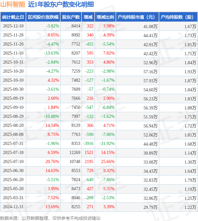 从股价来看,2025年11月28日至2025年12月10日,山科智能区间跌幅为3.82%,在此期间股东户数增加322.0户,增幅为3.98%。
