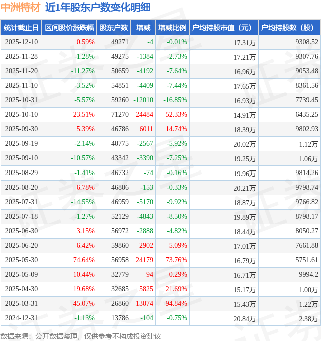 从股价来看,2025年11月28日至2025年12月10日,中洲特材区间涨幅为0.59%,在此期间股东户数减少4.0户,减幅为0.01%。