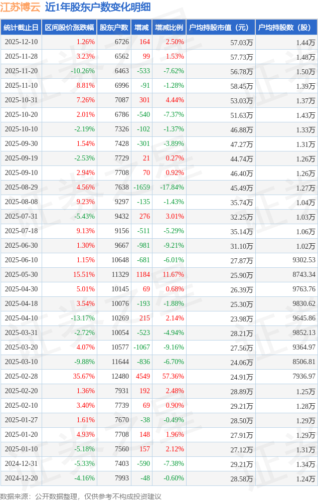 从股价来看,2025年11月28日至2025年12月10日,江苏博云区间涨幅为1.26%,在此期间股东户数增加164.0户,增幅为2.5%。