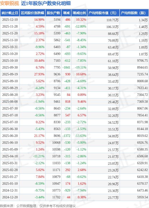 从股价来看,2025年11月28日至2025年12月10日,安联锐视区间涨幅为14.9%,在此期间股东户数增加486.0户,增幅为10.32%。