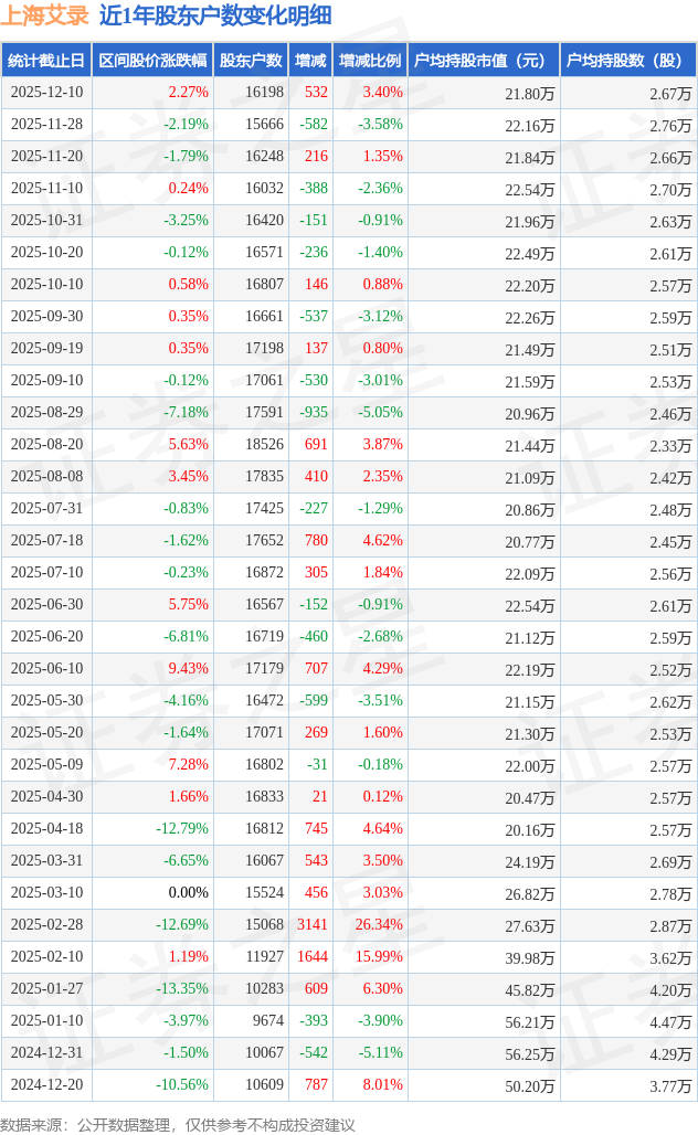 从股价来看,2025年11月28日至2025年12月10日,上海艾录区间涨幅为2.27%,在此期间股东户数增加532.0户,增幅为3.4%。