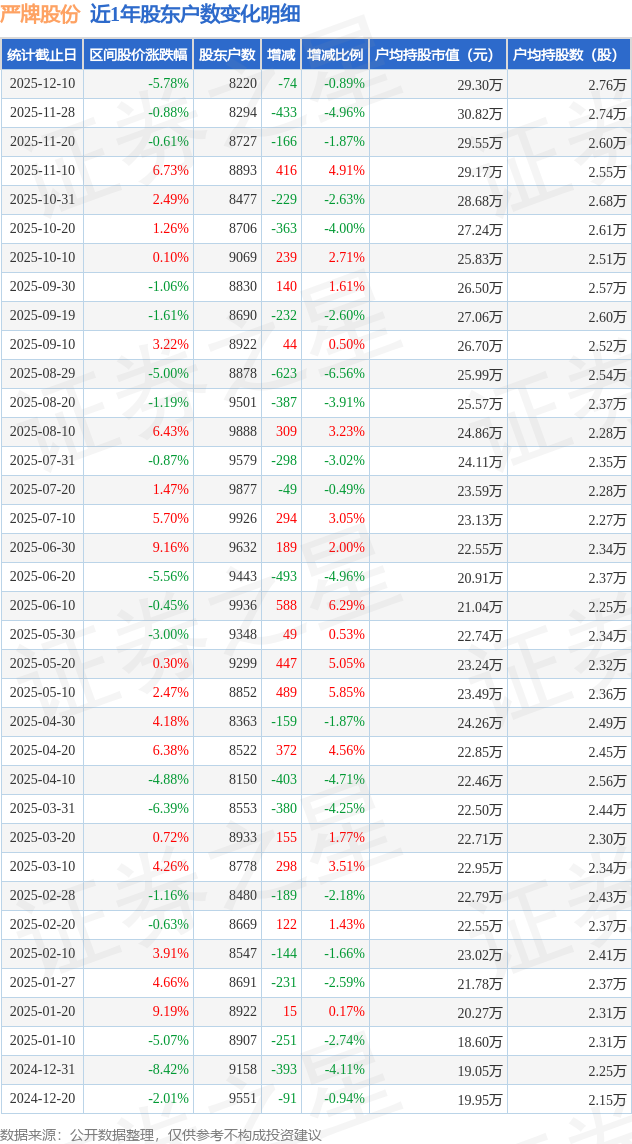 从股价来看,2025年11月28日至2025年12月10日,严牌股份区间跌幅为5.78%,在此期间股东户数减少74.0户,减幅为0.89%。
