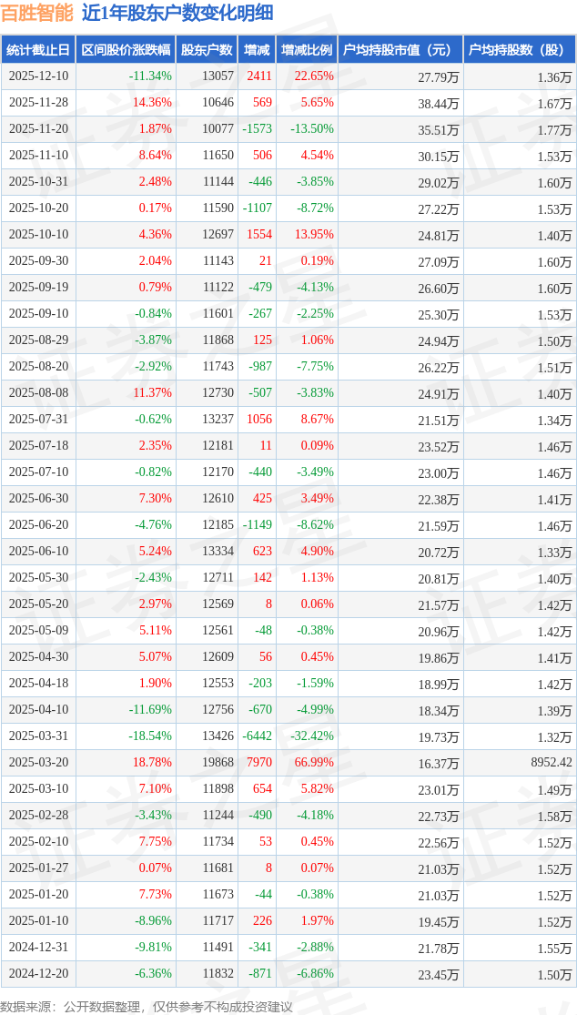 从股价来看,2025年11月28日至2025年12月10日,百胜智能区间跌幅为11.34%,在此期间股东户数增加2411.0户,增幅为22.65%。