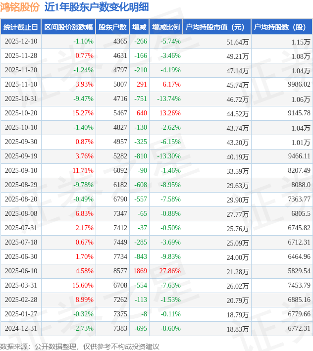 从股价来看,2025年11月28日至2025年12月10日,鸿铭股份区间跌幅为1.1%,在此期间股东户数减少266.0户,减幅为5.74%。