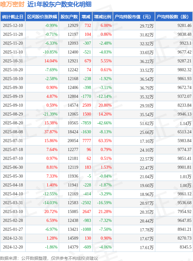 从股价来看,2025年11月28日至2025年12月10日,唯万密封区间跌幅为0.99%,在此期间股东户数增加732.0户,增幅为6.0%。