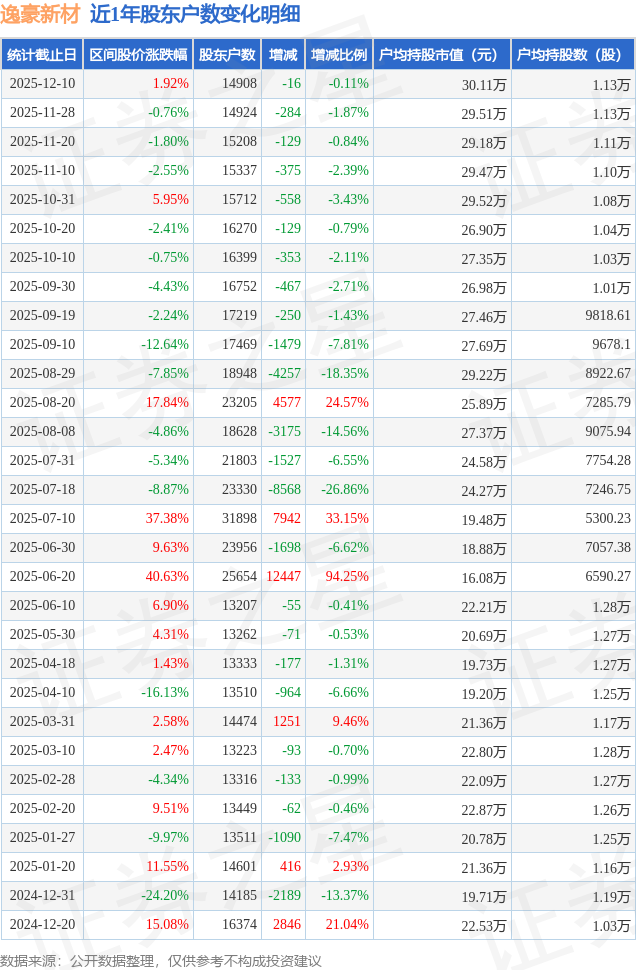 从股价来看,2025年11月28日至2025年12月10日,逸豪新材区间涨幅为1.92%,在此期间股东户数减少16.0户,减幅为0.11%。