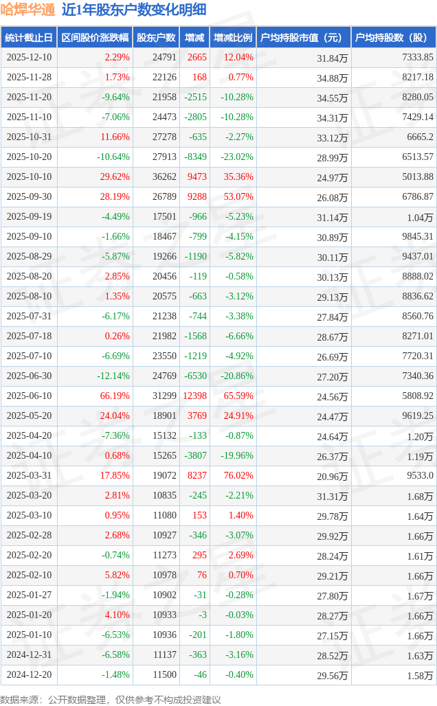 从股价来看,2025年11月28日至2025年12月10日,哈焊华通区间涨幅为2.29%,在此期间股东户数增加2665.0户,增幅为12.04%。