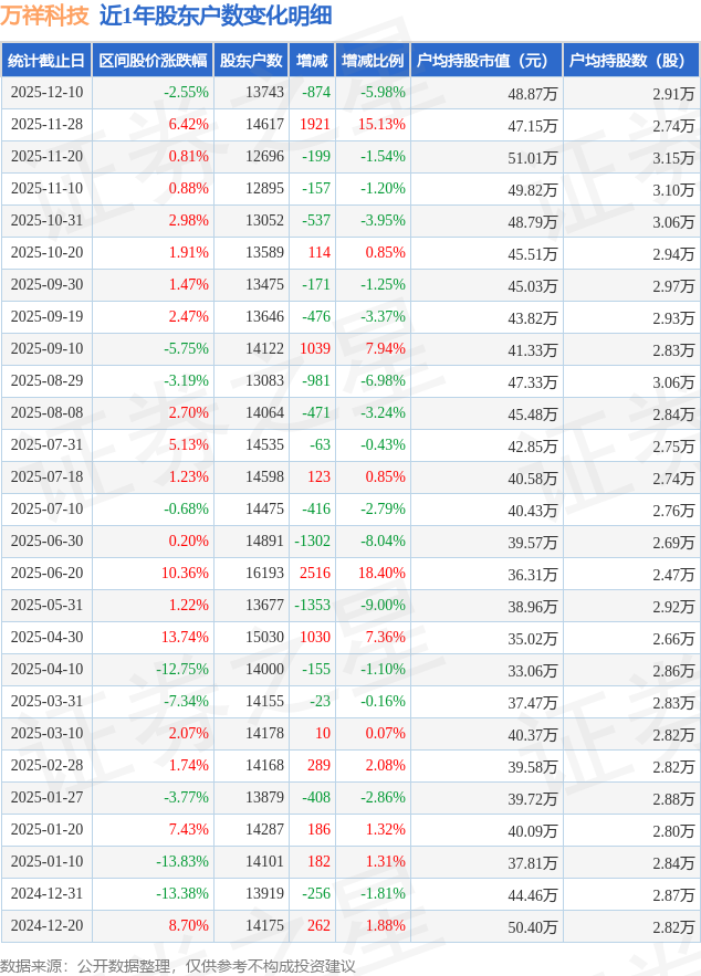从股价来看,2025年11月28日至2025年12月10日,万祥科技区间跌幅为2.55%,在此期间股东户数减少874.0户,减幅为5.98%。