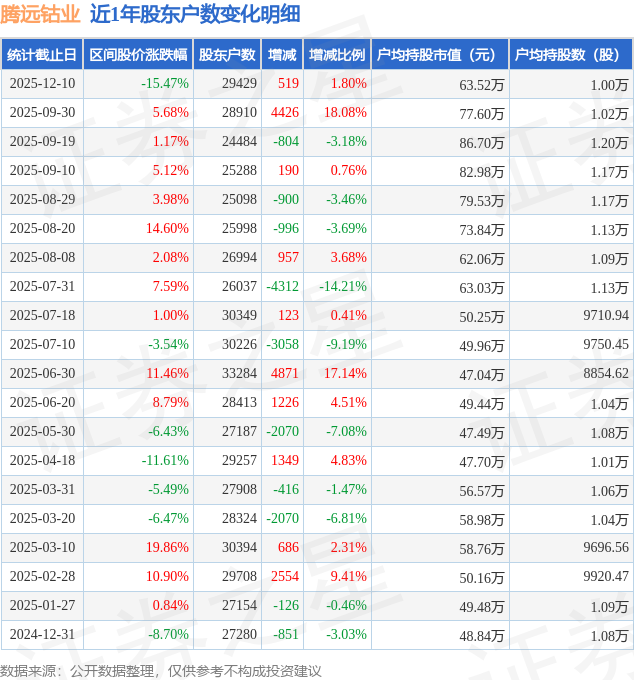 从股价来看,2025年9月30日至2025年12月10日,腾远钴业区间跌幅为15.47%,在此期间股东户数增加519.0户,增幅为1.8%。