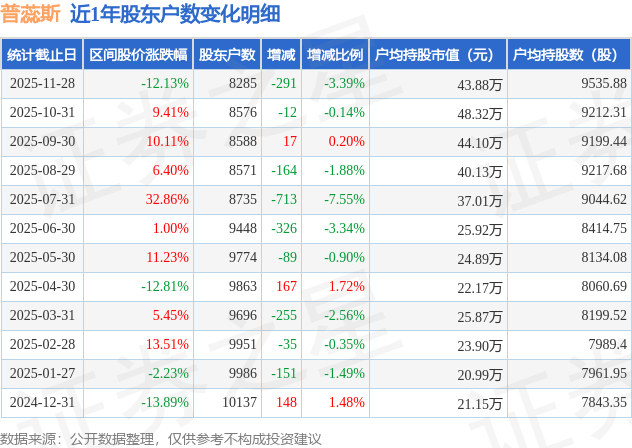 从股价来看,2025年10月31日至2025年11月28日,普蕊斯区间跌幅为12.13%,在此期间股东户数减少291.0户,减幅为3.39%。