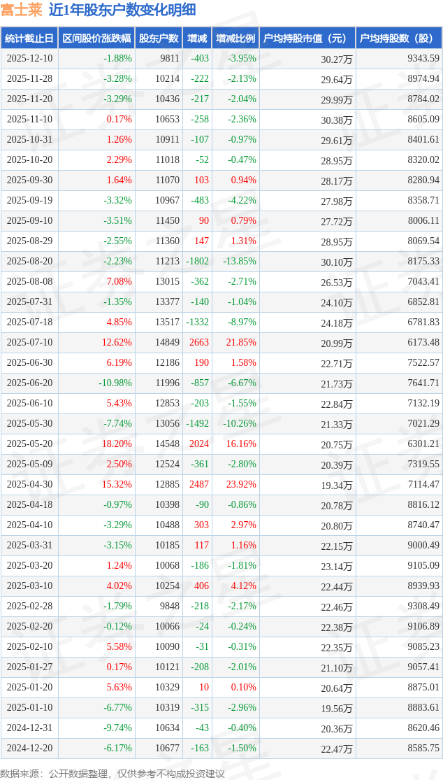 从股价来看,2025年11月28日至2025年12月10日,富士莱区间跌幅为1.88%,在此期间股东户数减少403.0户,减幅为3.95%。