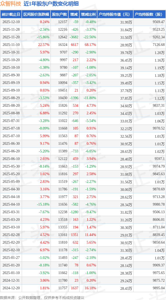 从股价来看,2025年11月28日至2025年12月10日,众智科技区间涨幅为0.24%,在此期间股东户数减少59.0户,减幅为0.48%。