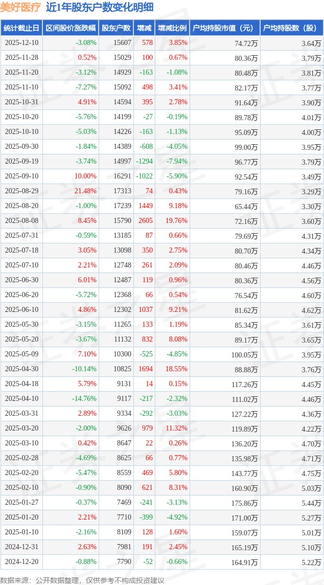 从股价来看,2025年11月28日至2025年12月10日,美好医疗区间跌幅为3.08%,在此期间股东户数增加578.0户,增幅为3.85%。