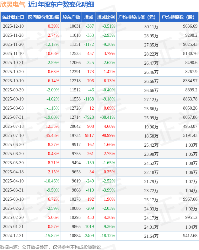 从股价来看,2025年11月28日至2025年12月10日,欣灵电气区间涨幅为0.39%,在此期间股东户数减少387.0户,减幅为3.51%。