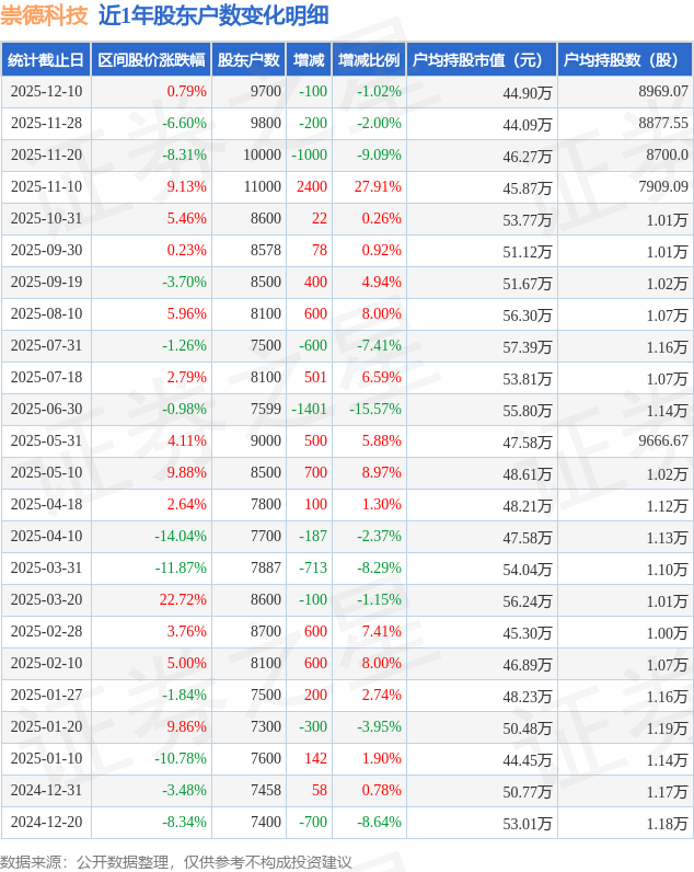 从股价来看,2025年11月28日至2025年12月10日,崇德科技区间涨幅为0.79%,在此期间股东户数减少100.0户,减幅为1.02%。
